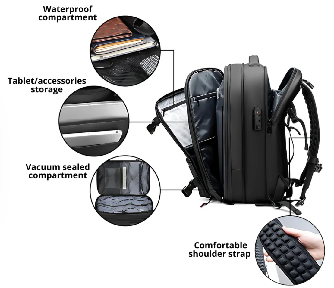 Rymdryggsäck™ är ryggsäcken som får dina saker att ta mindre plats, så att du kan bära mer utan extra volym. Packa bara, tryck och ta bort överflödig luft – och få upp till 5 gånger mer utrymme än en vanlig ryggsäck. Perfekt för resor, skola eller vardagsbruk.